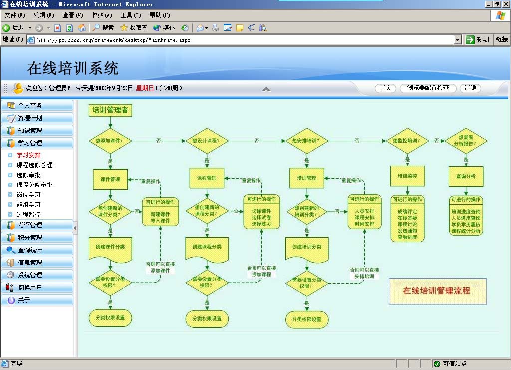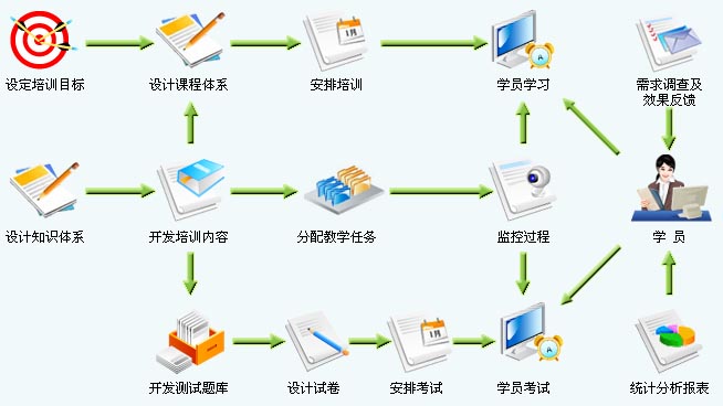 课程体系设计:依据培训目标、岗位要求和个人职业规划等,建立统一的,科学的,长期的课程体系,为具体的培训安排提供参考和模板的作用。例如:可以设定[新员工任职培训体系],[部门经理岗位培训体系]等。在每一个培训体系中,可以设定各课程结点的学习次序和相互之间的约束关系。例如:学习课程C之前,必需完成课程A和B的学习等。