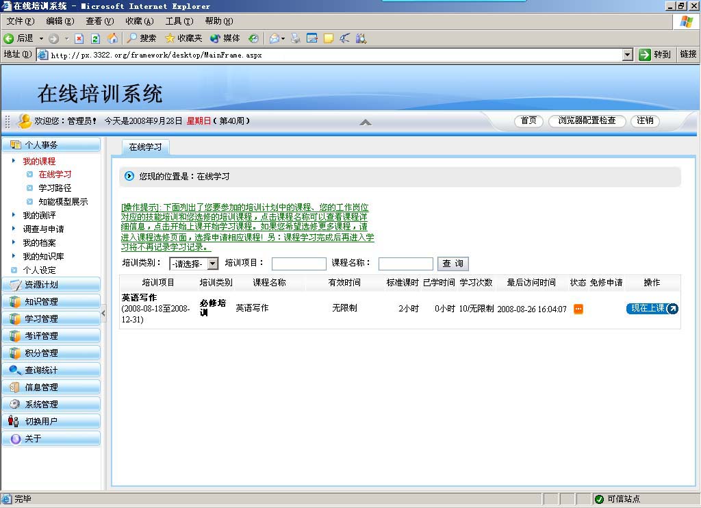 课程目录:学员可以查看系统内所有的课程,并且可以提出选修申请。